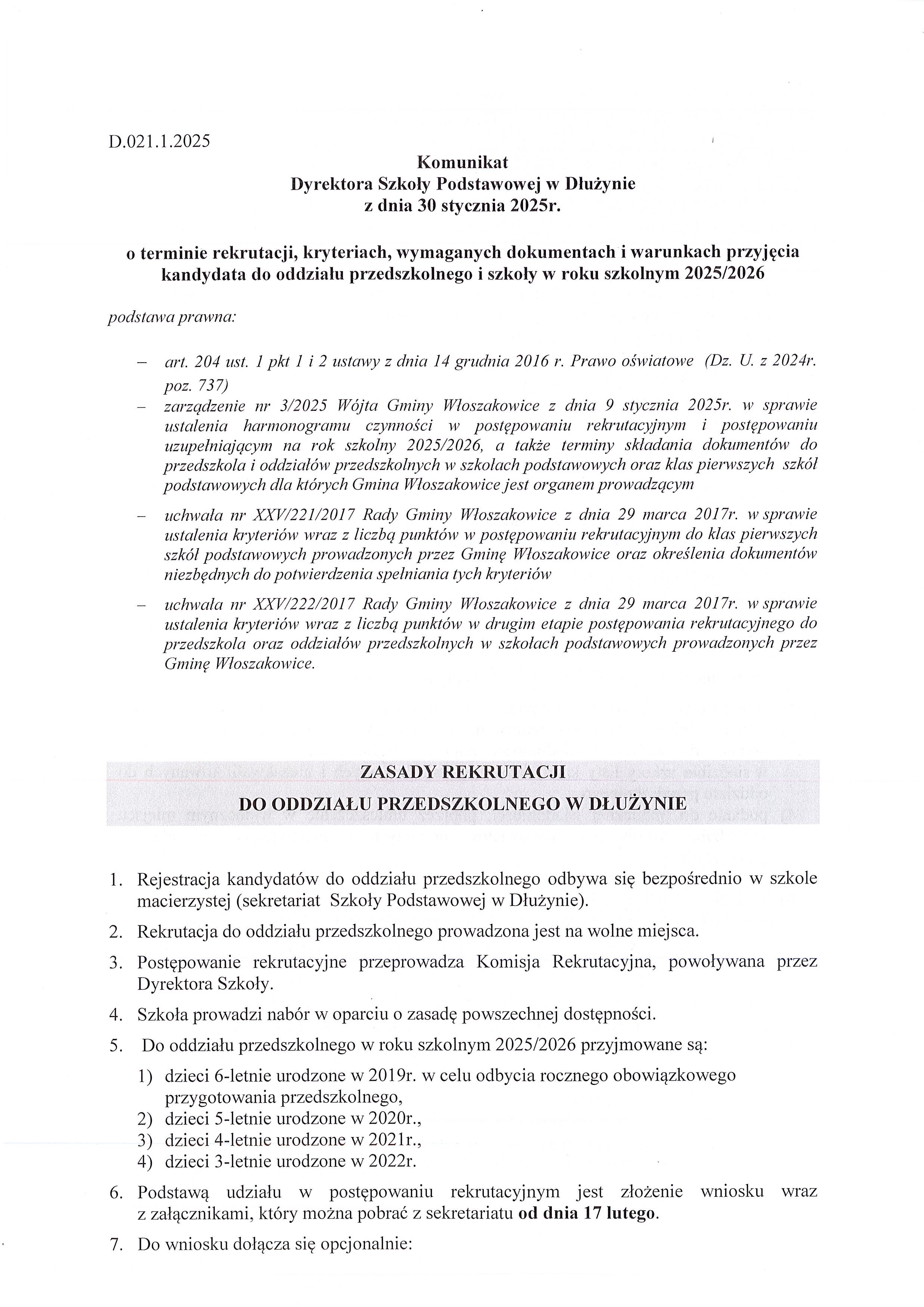 - Komunikat Dyrektora Szkoły Podstawowej w Dłużynie z dnia 30 stycznia 2025 r. o terminie rekrutacji, kryteriach, wymaganych dokumentach i warunkach przyjęcia kandydata do oddziału przedszkolnego i szkoły w roku szkolnym 2025/2026 [pobierz: str.1, str.2, str.3, str.4, str.5]