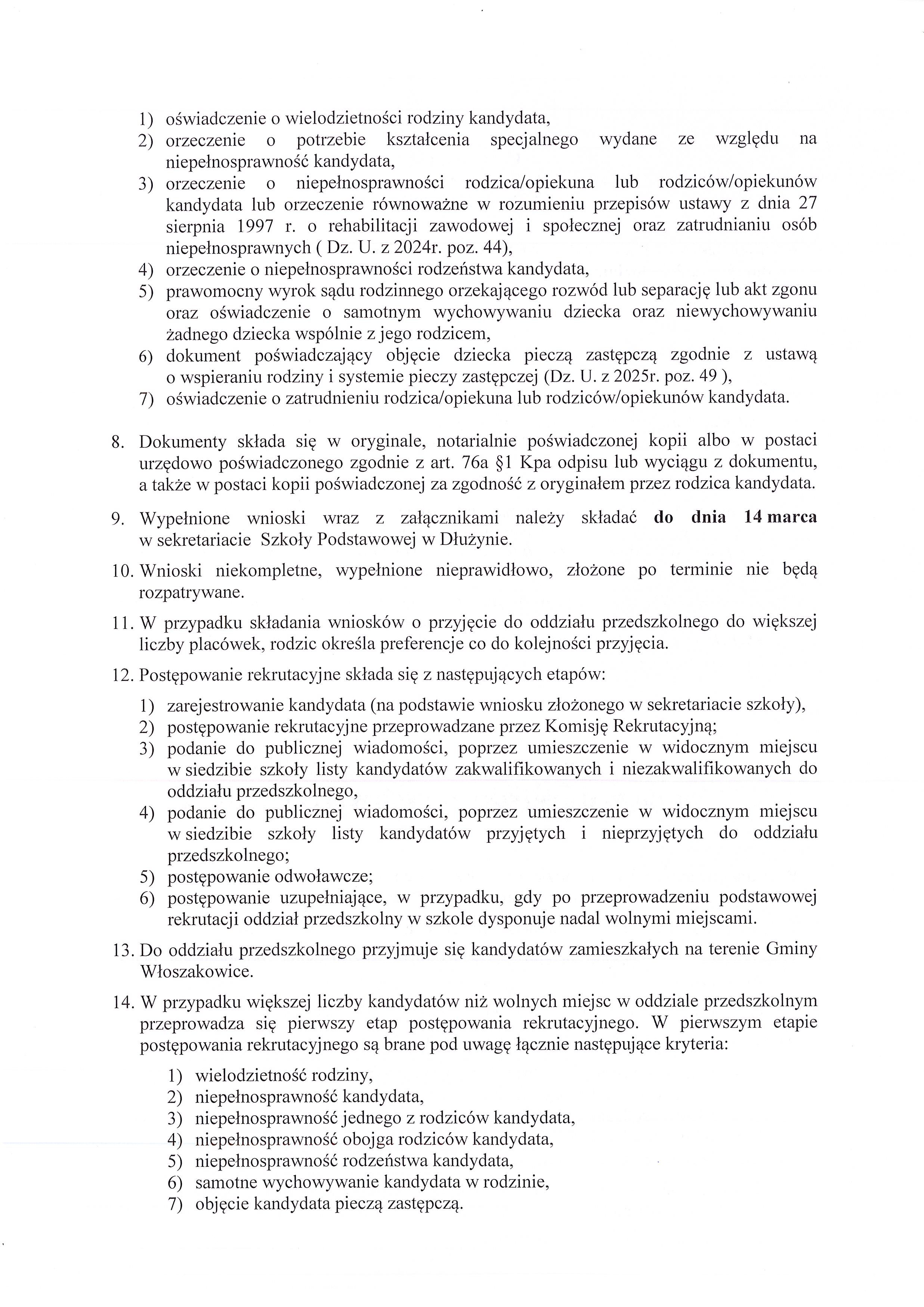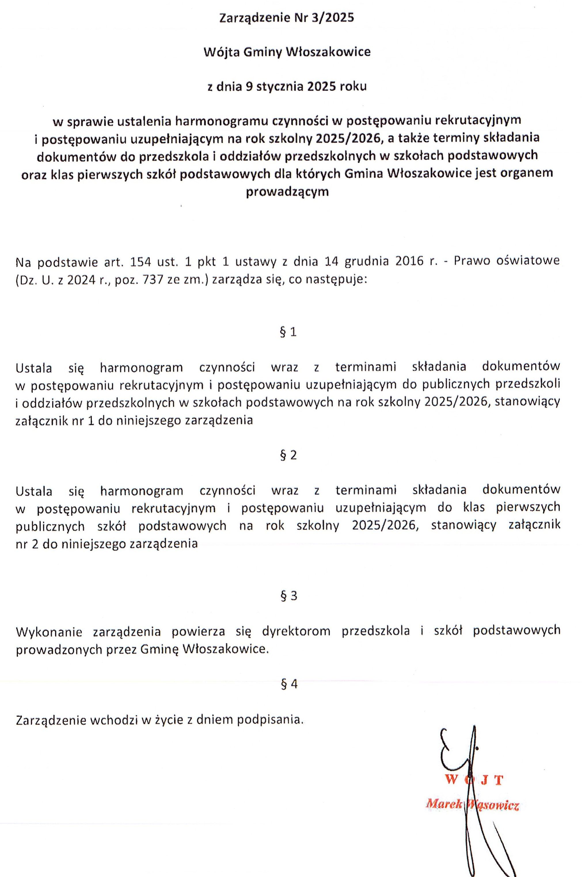 - Zarządzenie nr 3/2025 Wójta Gminy Włoszakowice z dnia 9 stycznia 2025r. w sprawie ustalenia harmonogramu czynności w postępowaniu rekrutacyjnym i postępowaniu uzupełniającym na rok szkolny 2025/2026, a także terminy składania dokumentów do przedszkola i oddziałów przedszkolnych w szkoła podstawowych oraz klas pierwszych szkół podstawowych dla których Gmina Włoszakowice jest organem prowadzącym. [zarządzenie, załącznik nr 1 - str.1 i str.2] - oddz.przedszkolny, [załącznik nr 2 - str.1 i str.2] - szkoła podstawowa].