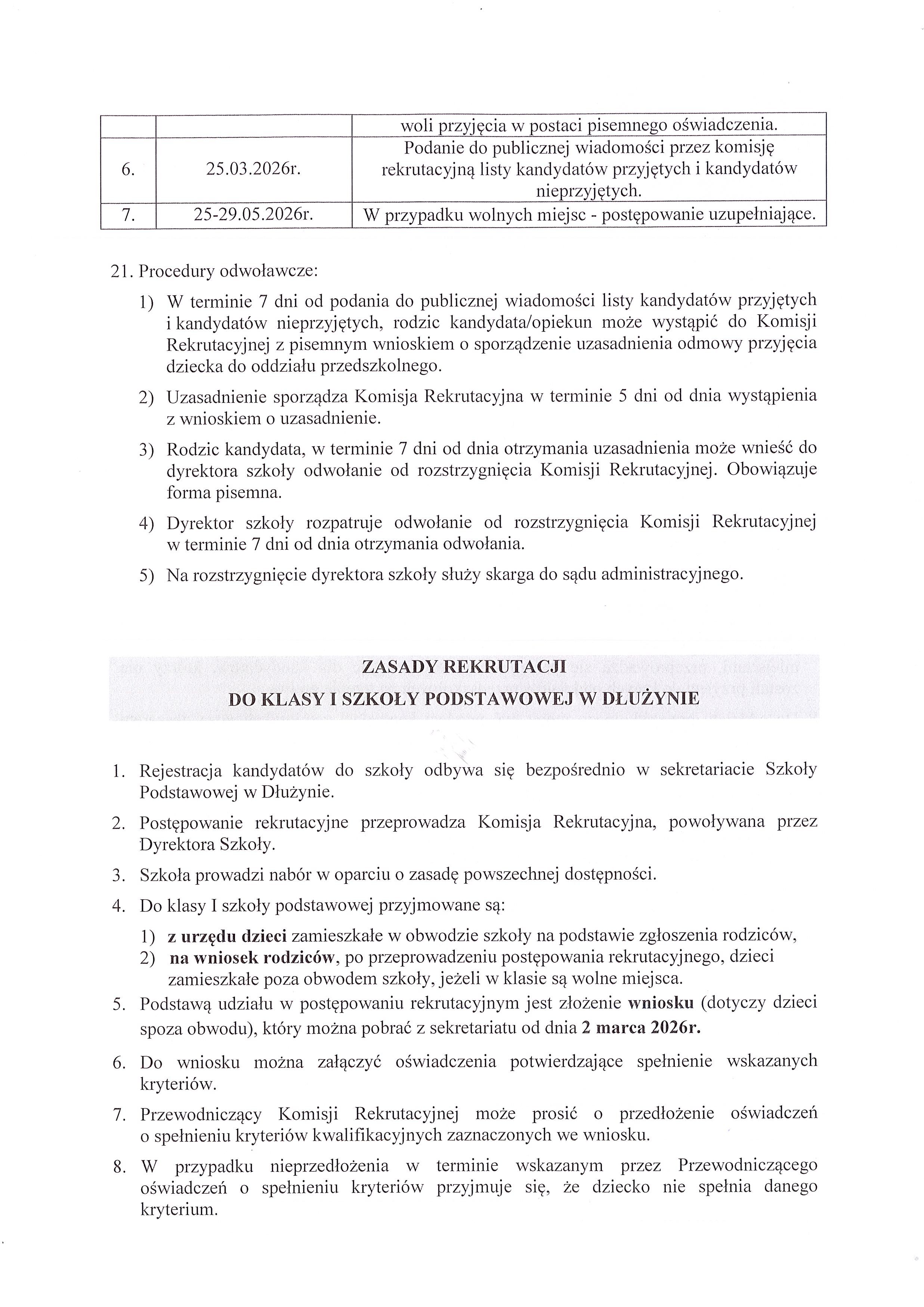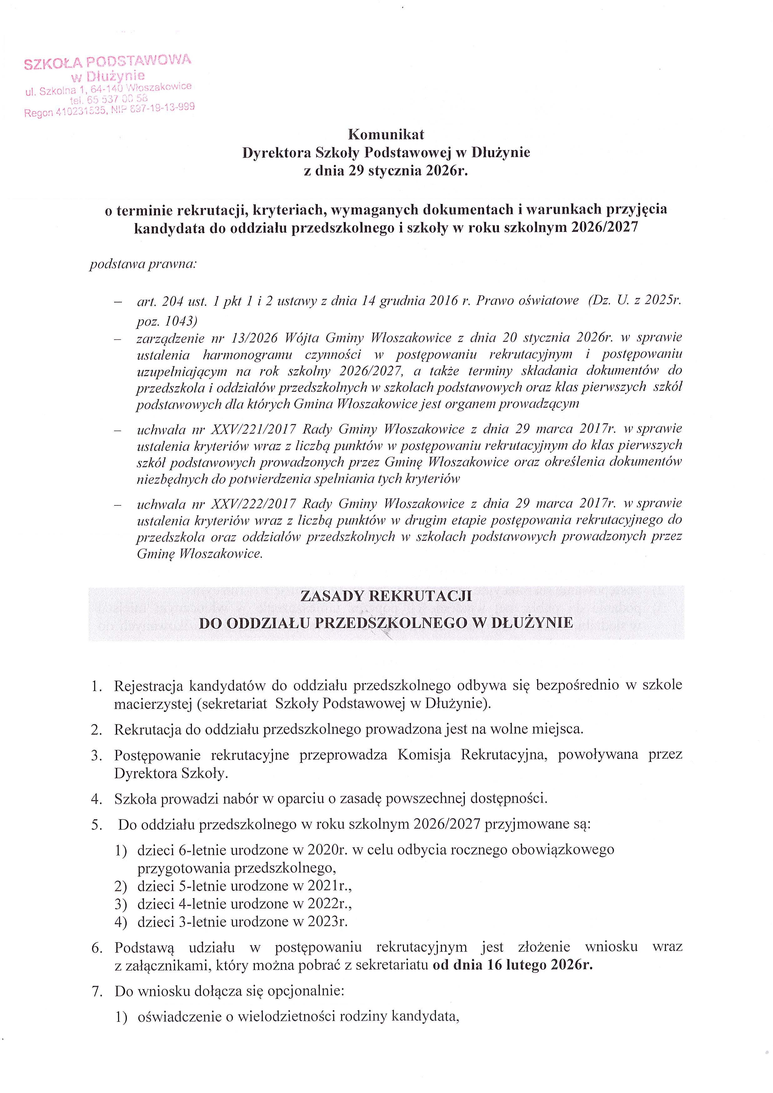 - Komunikat Dyrektora Szkoły Podstawowej w Dłużynie z dnia 29 stycznia 2026 r. o terminie rekrutacji, kryteriach, wymaganych dokumentach i warunkach przyjęcia kandydata do oddziału przedszkolnego i szkoły w roku szkolnym 2026/2027 [pobierz: str.1, str.2, str.3, str.4, str.5]