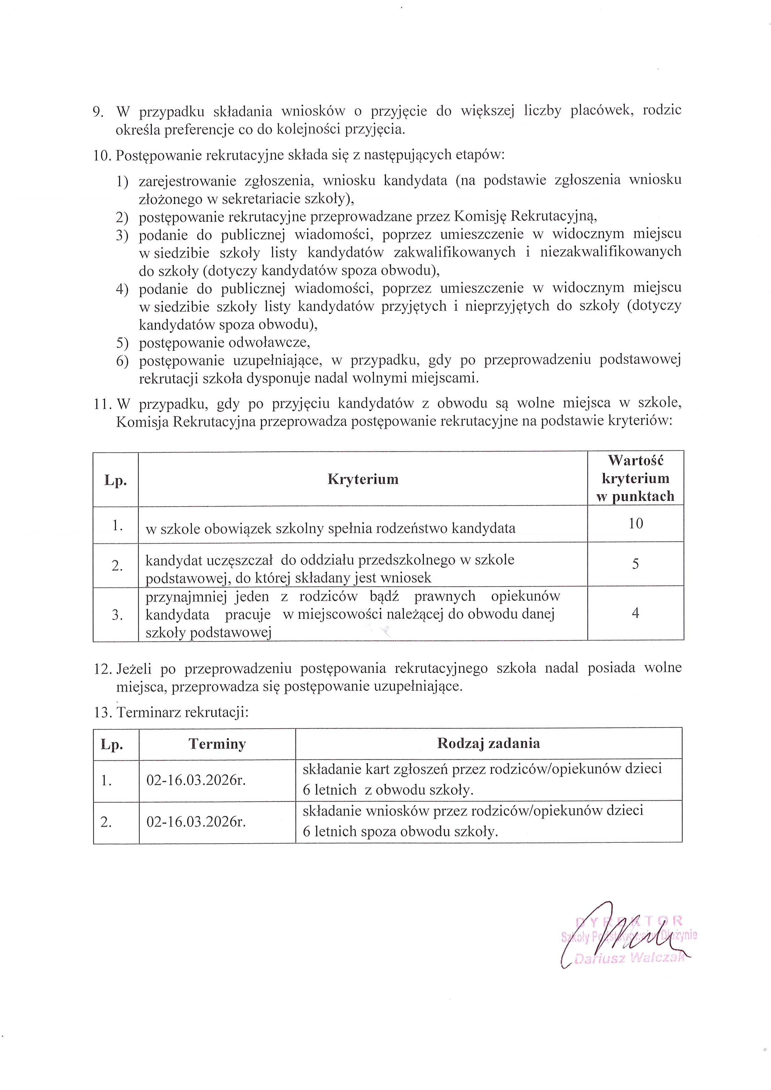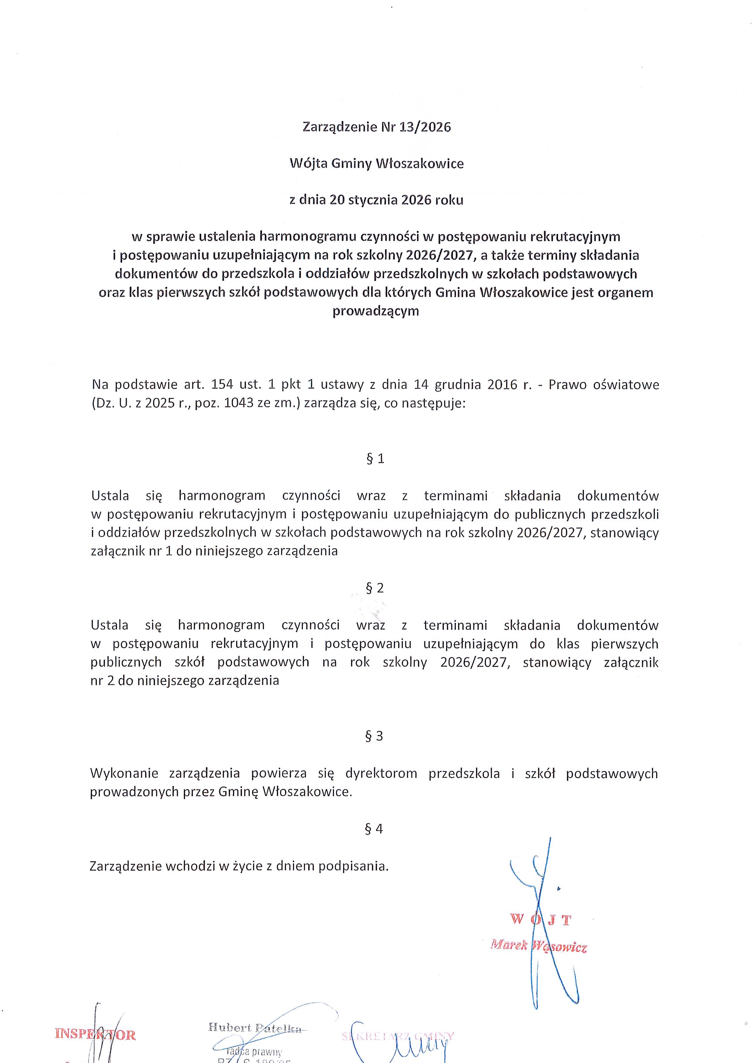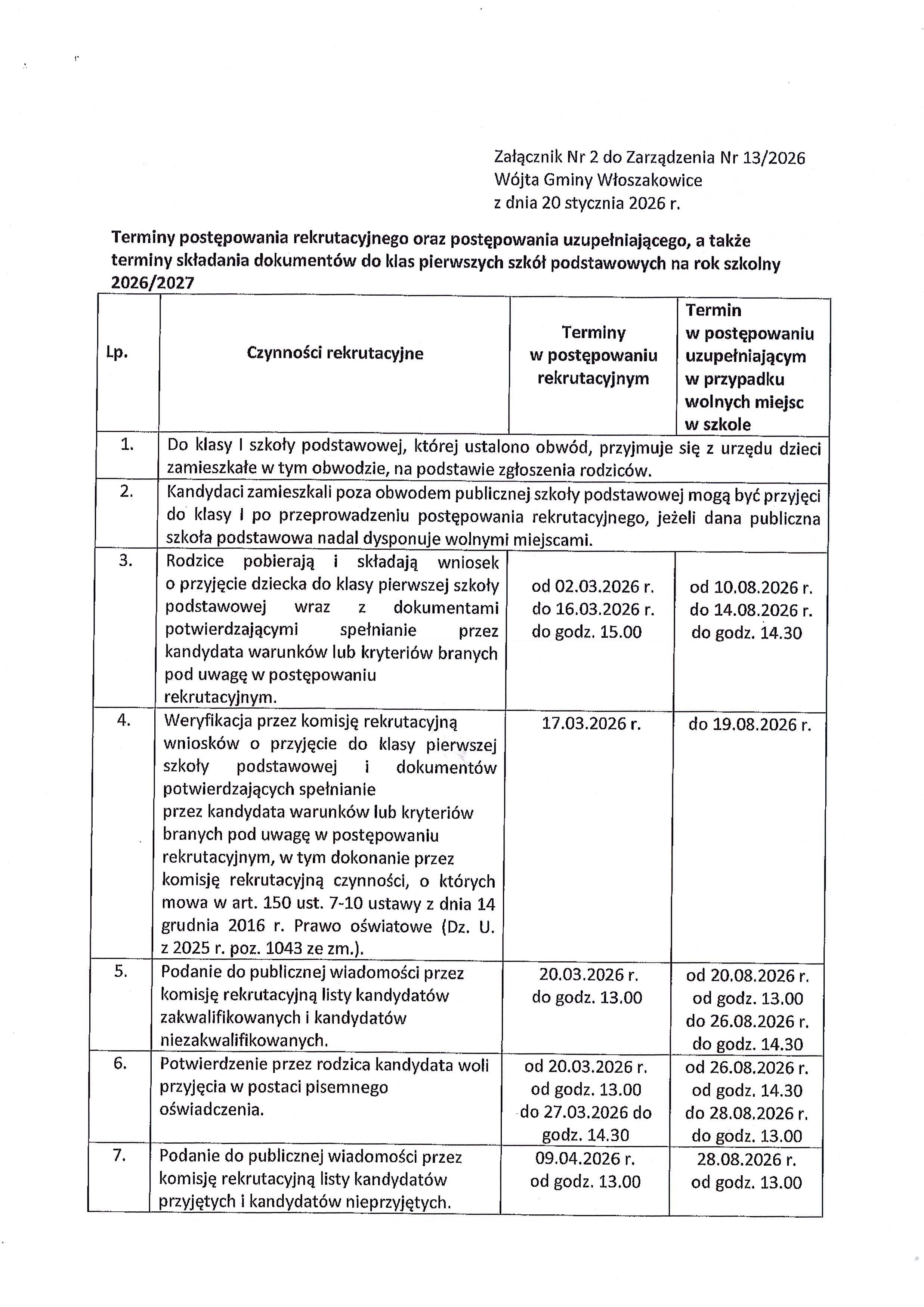- Zarządzenie nr 13/2026 Wójta Gminy Włoszakowice z dnia 20 stycznia 2026r. w sprawie ustalenia harmonogramu czynności w postępowaniu rekrutacyjnym i postępowaniu uzupełniającym na rok szkolny 2026/2027, a także terminy składania dokumentów do przedszkola i oddziałów przedszkolnych w szkoła podstawowych oraz klas pierwszych szkół podstawowych dla których Gmina Włoszakowice jest organem prowadzącym. [zarządzenie, załącznik nr 1 - str.1 i str.2] - oddział przedszkolny, [załącznik nr 2 - str.1 i str.2] - szkoła podstawowa].