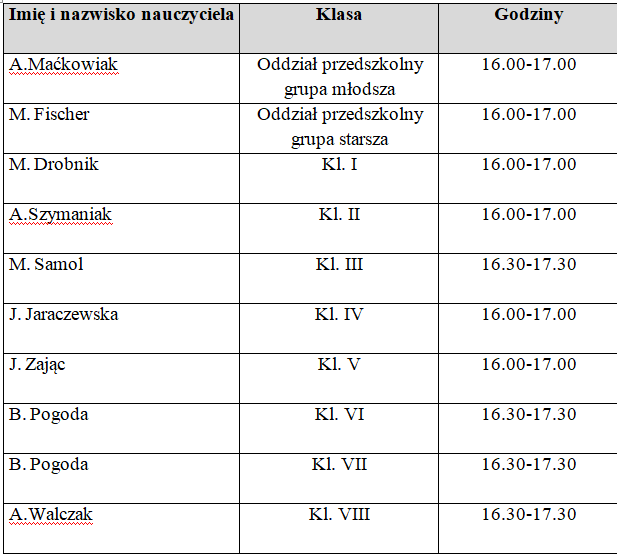 Serdecznie zapraszamy rodziców na spotkania z wychowawcami podsumowujące I okres nauki. Spotkania odbędą się 28 stycznia według poniższego harmonogramu.