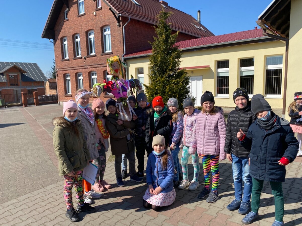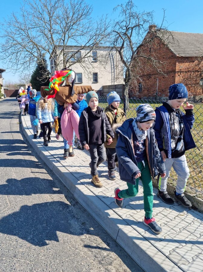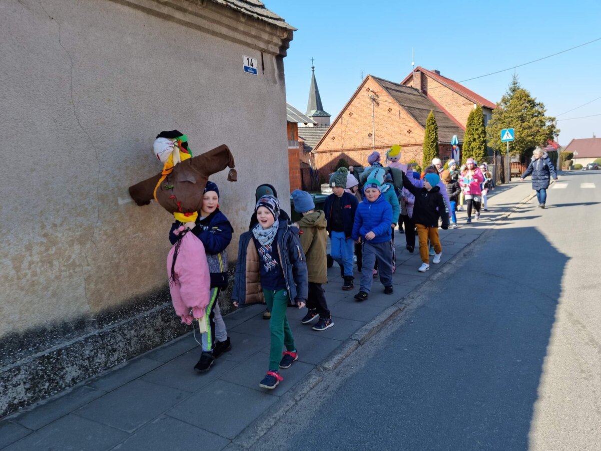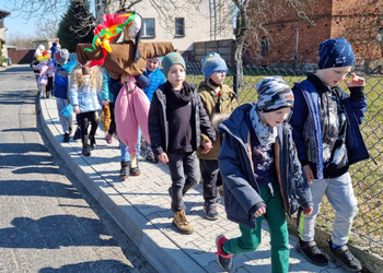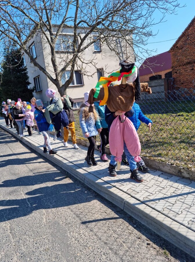 Pierwszy Dzień Wiosny to dla wielu z nas jeden ulubionych dni w roku. To dzień zabawy oraz radosnego powitania wiosny. Podobnie było i w tym roku. Piękna pogoda dopisywała nam od samego rana, a nastroje uczniów mówiły nam o tym, że wiosna nadchodzi. Klasy I-III wzięły tego dnia udział w podchodach, zorganizowanych na terenie naszej szkoły. Do odszukania i rozwiązania mieli 11 zadań z różnych obszarów edukacji. Po ukończeniu każdego zadania, uczniowie otrzymywali literki, które w rezultacie utworzyły hasło "Witaj wiosno". Dzieci musiały między innymi wykazać się sprytem, spostrzegawczością czy celnością. Współpracując ze sobą i świetnie się przy tym bawiąc udało im się rozwiązać wszystkie 11 zadań. Układanie puzzli, rozwiązywanie zagadek czy zadań matematycznych pozytywnie zmęczyło naszych uczniów. Po skończonych zabawach, uczniowie wyszli na ulice Dłużyny, by w kolorowym korowodzie powitać wiosnę. Nie zabrakło także Marzanny, czyli symbolu wiosny. Uczniowie byli bardzo zadowoleni i pełni optymizmu oczekują na kolejne dni przepięknej wiosny.