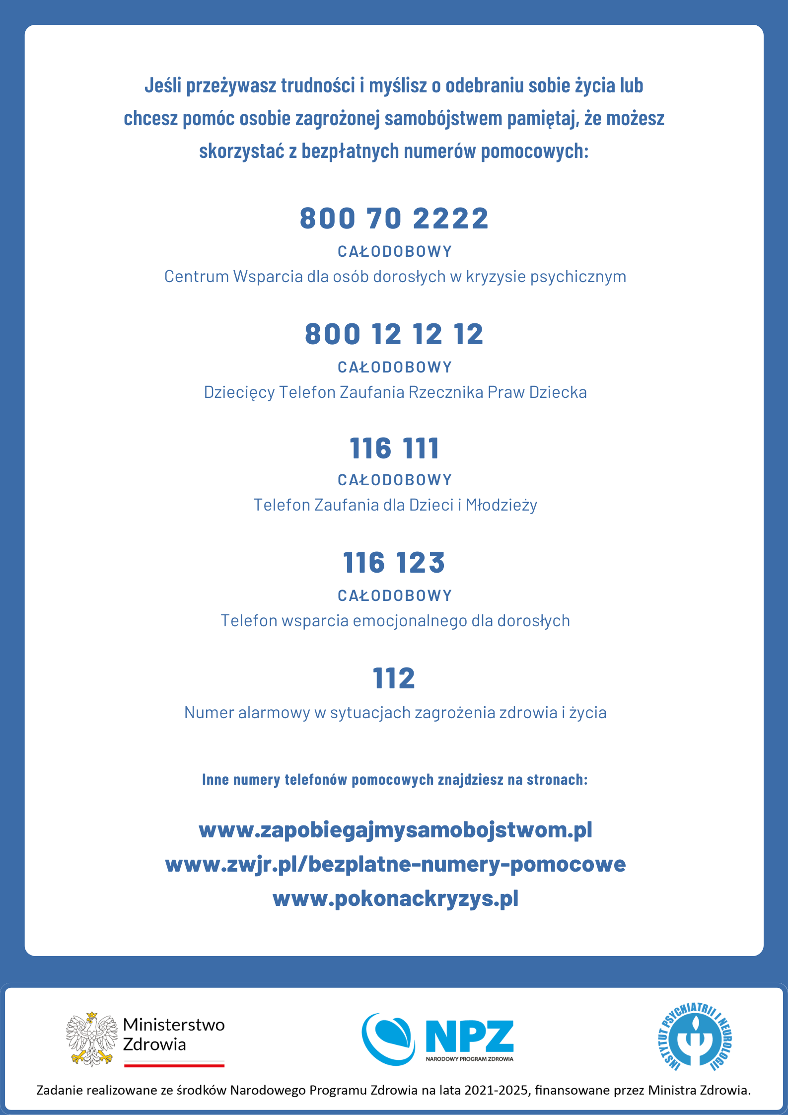 Załączone numery telefonów i infolinii pomocowych gwarantują szybki dostęp do informacji i wsparcia, jak również podejmowanie interwencji w sprawach ważnych z punktu widzenia zdrowia psychicznego i bezpieczeństwa dzieci oraz młodzieży.