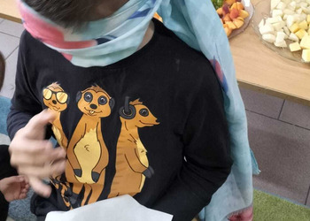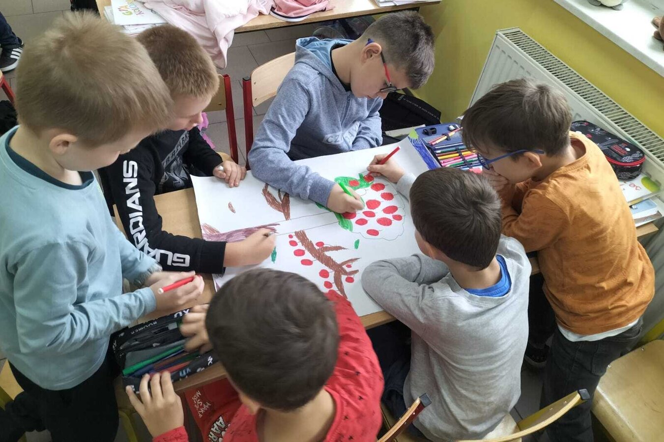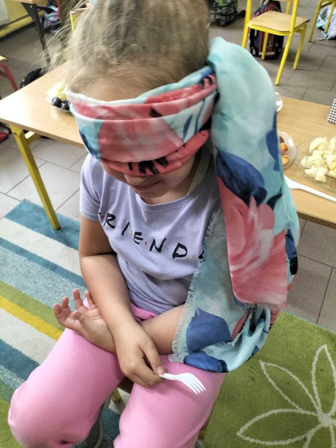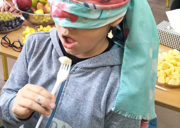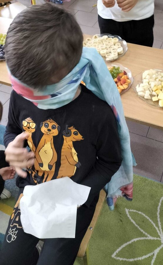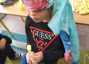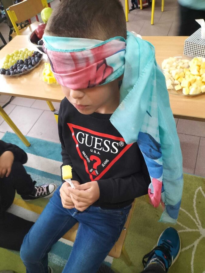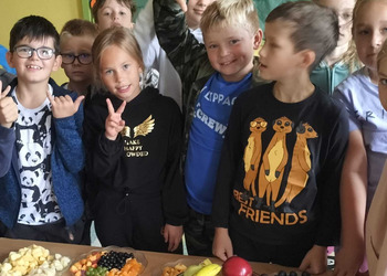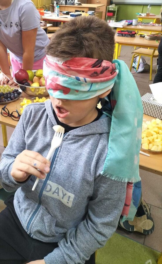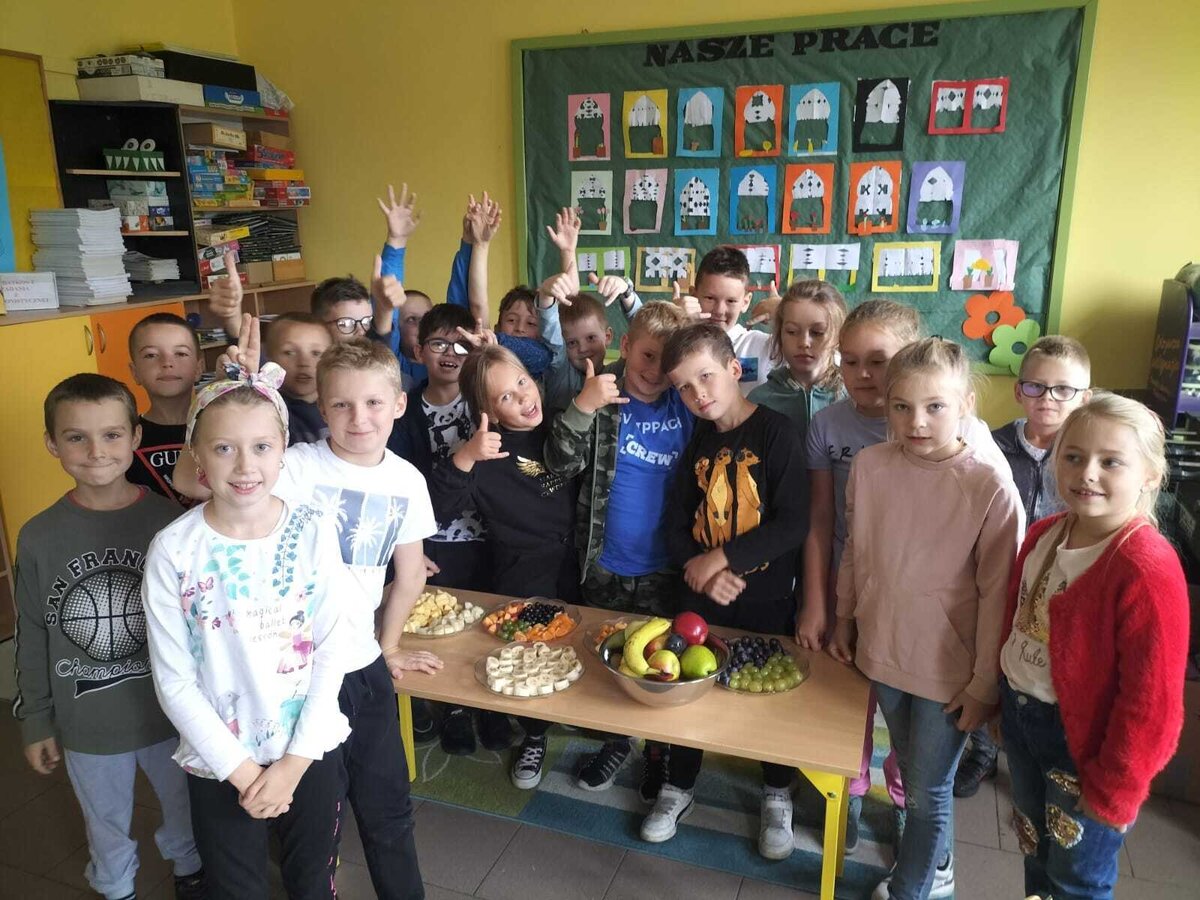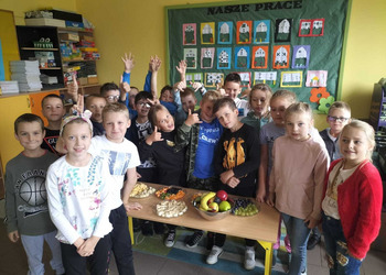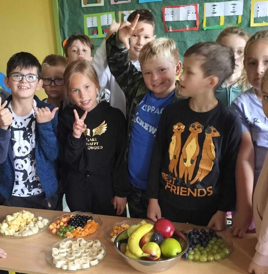W klasie 2 uczniowie uczestniczyli w zabawie "Wiem, co jem!". Wszystkie dzieci z zawiązanymi oczami próbowały owoców i starały się odgadnąć, co jedzą. Uczniowie bawili się wspaniale oraz bezbłędnie odgadywali nazwy owoców. Następnie w grupach tworzyli plakaty, które przedstawiały krzew i drzewno oraz zaznaczali ich elementy. Uczniowie stworzyli także plakat, który pokazywał etapy rozwoju rośliny od kwiatu do owocu. Na koniec wszyscy zjedli pyszną, owocową sałatkę.To była pyszna i ciekawa lekcja. Sprzęt wykorzystany podczas zajęć został zakupiony w ramach programu Laboratorium Przyszłości.