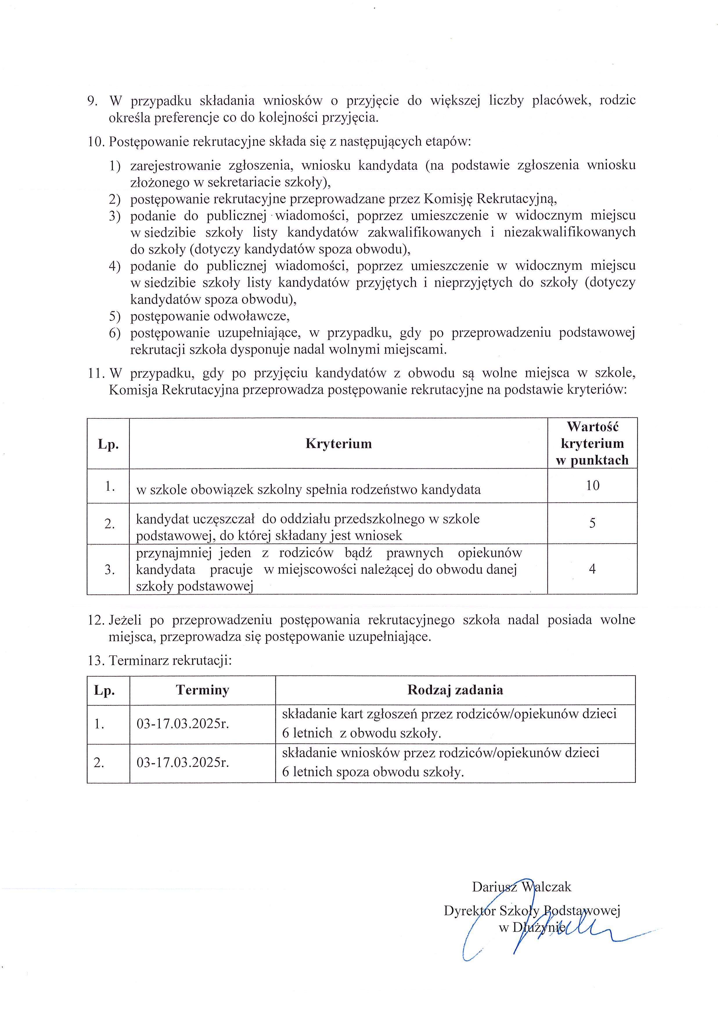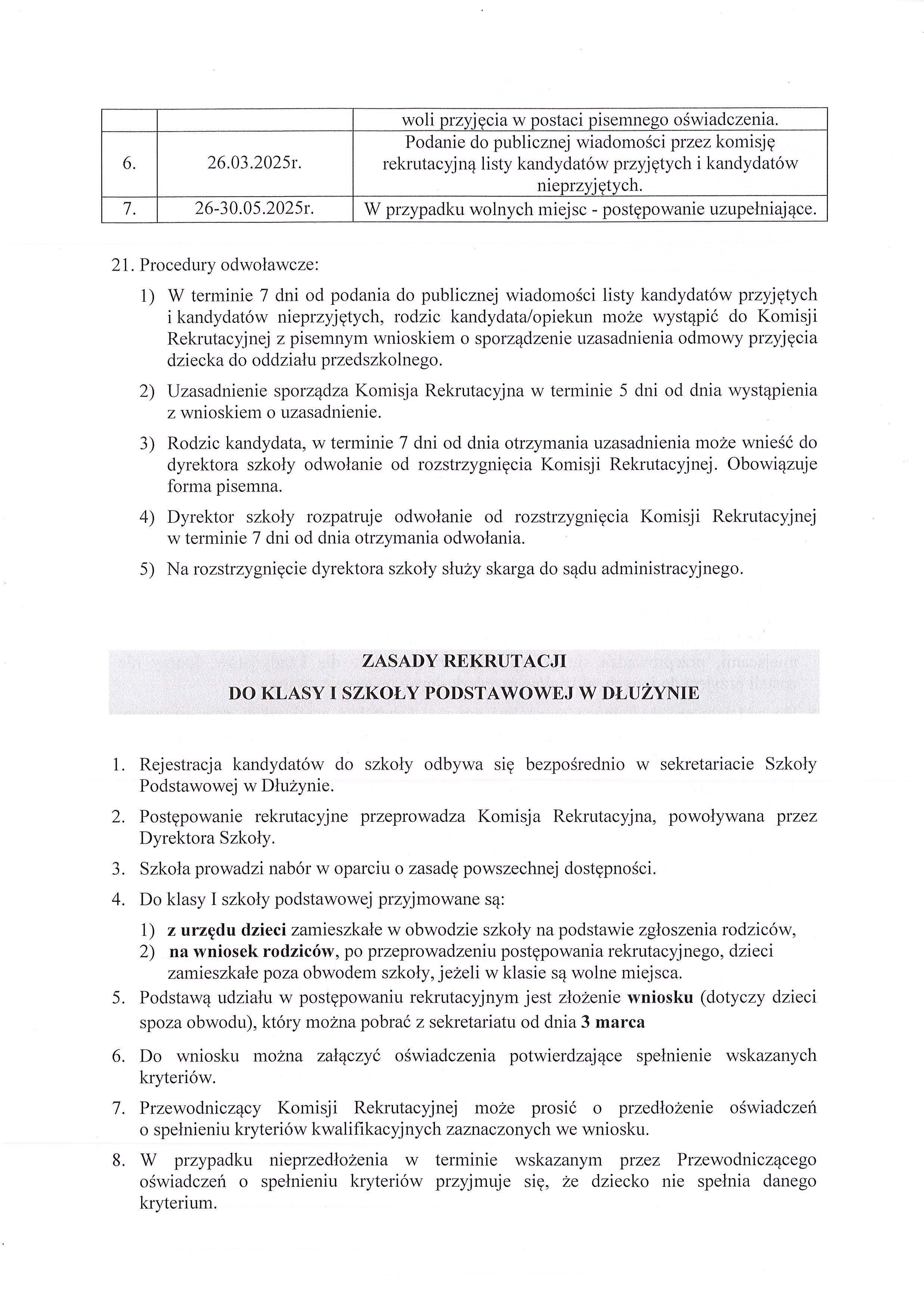 - Komunikat Dyrektora Szkoły Podstawowej w Dłużynie z dnia 30 stycznia 2025 r. o terminie rekrutacji, kryteriach, wymaganych dokumentach i warunkach przyjęcia kandydata do oddziału przedszkolnego i szkoły w roku szkolnym 2025/2026 [pobierz: str.1, str.2, str.3, str.4, str.5]
