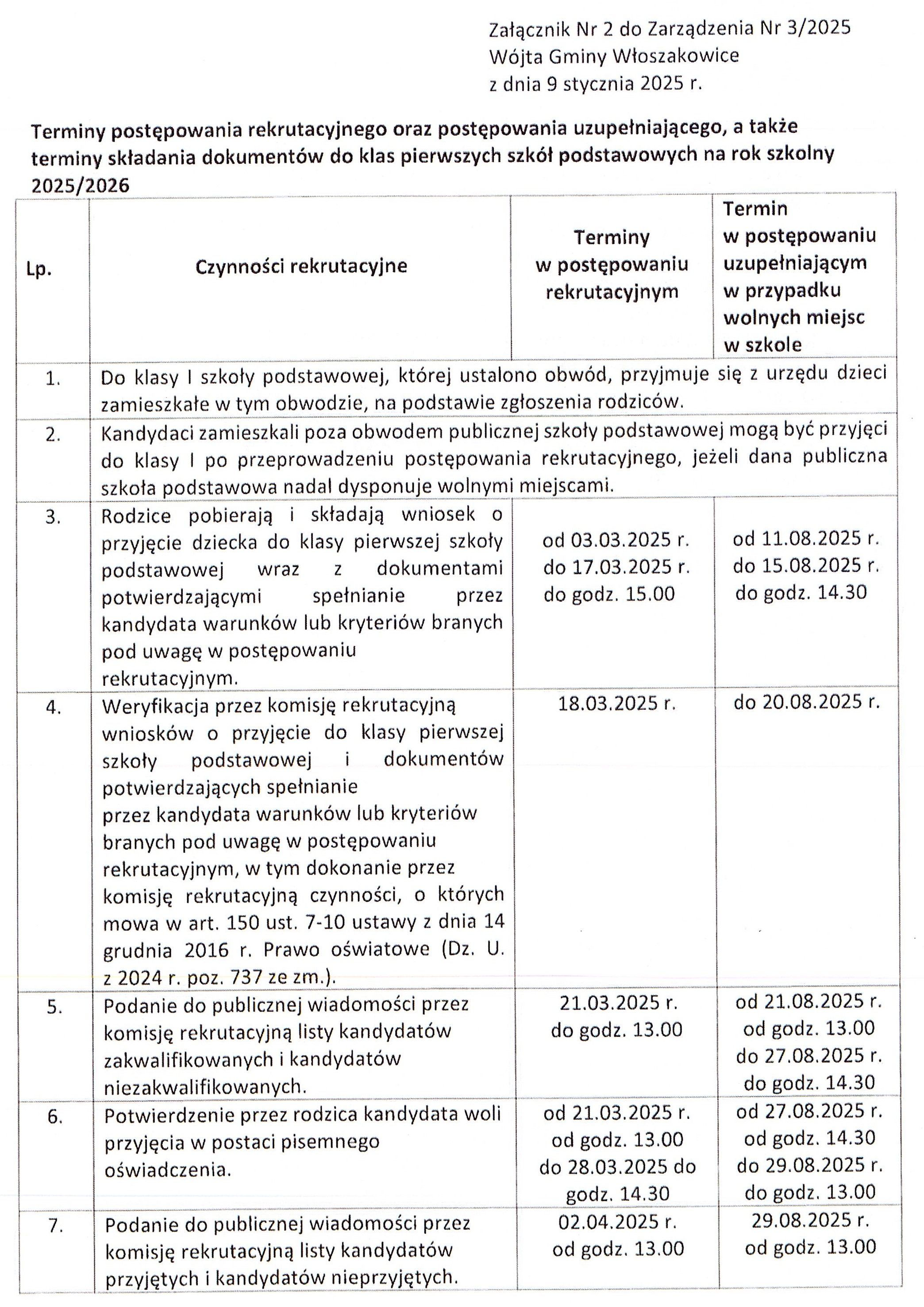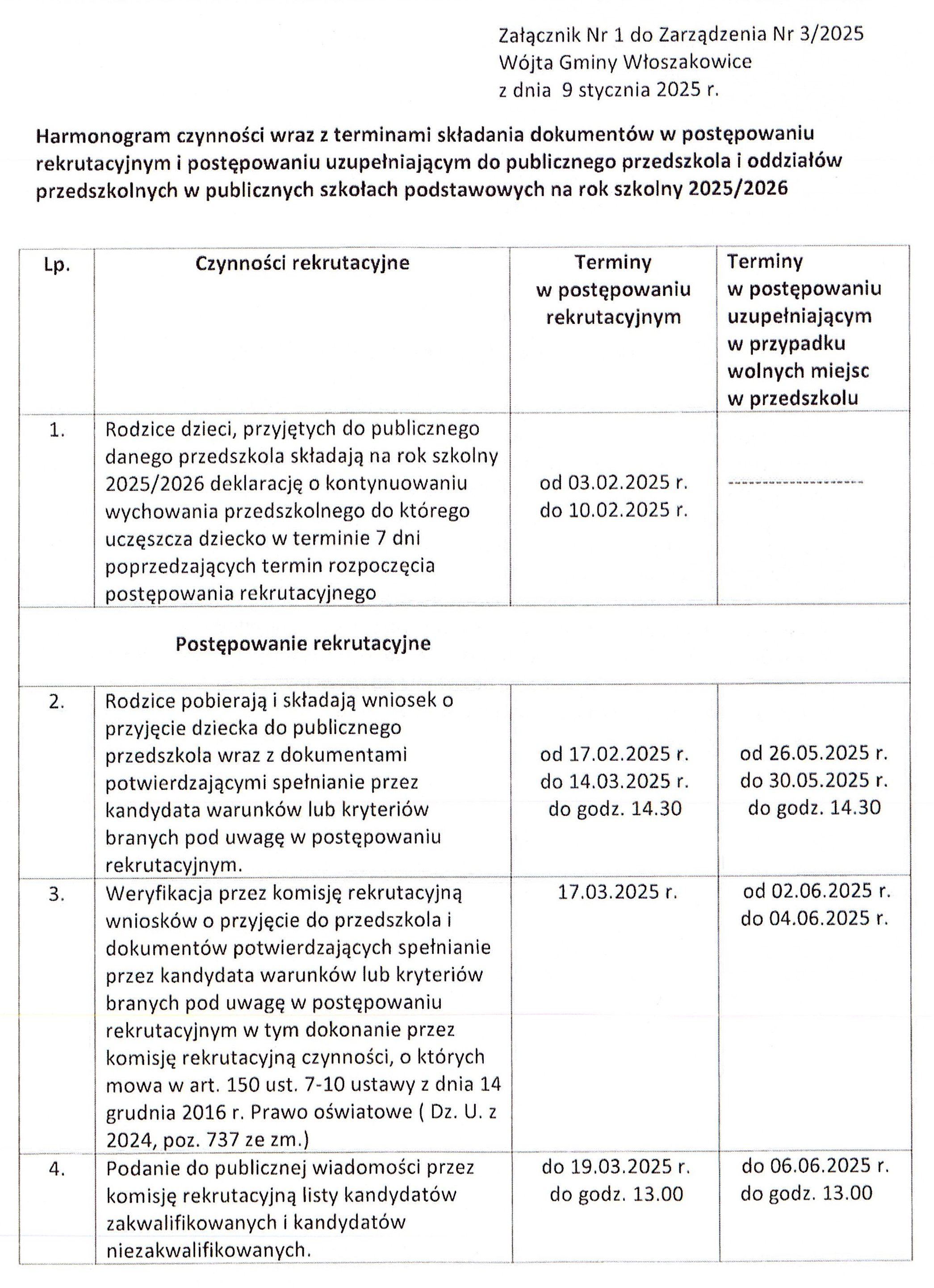 - Zarządzenie nr 3/2025 Wójta Gminy Włoszakowice z dnia 9 stycznia 2025r. w sprawie ustalenia harmonogramu czynności w postępowaniu rekrutacyjnym i postępowaniu uzupełniającym na rok szkolny 2025/2026, a także terminy składania dokumentów do przedszkola i oddziałów przedszkolnych w szkoła podstawowych oraz klas pierwszych szkół podstawowych dla których Gmina Włoszakowice jest organem prowadzącym. [zarządzenie, załącznik nr 1 - str.1 i str.2] - oddz.przedszkolny, [załącznik nr 2 - str.1 i str.2] - szkoła podstawowa].