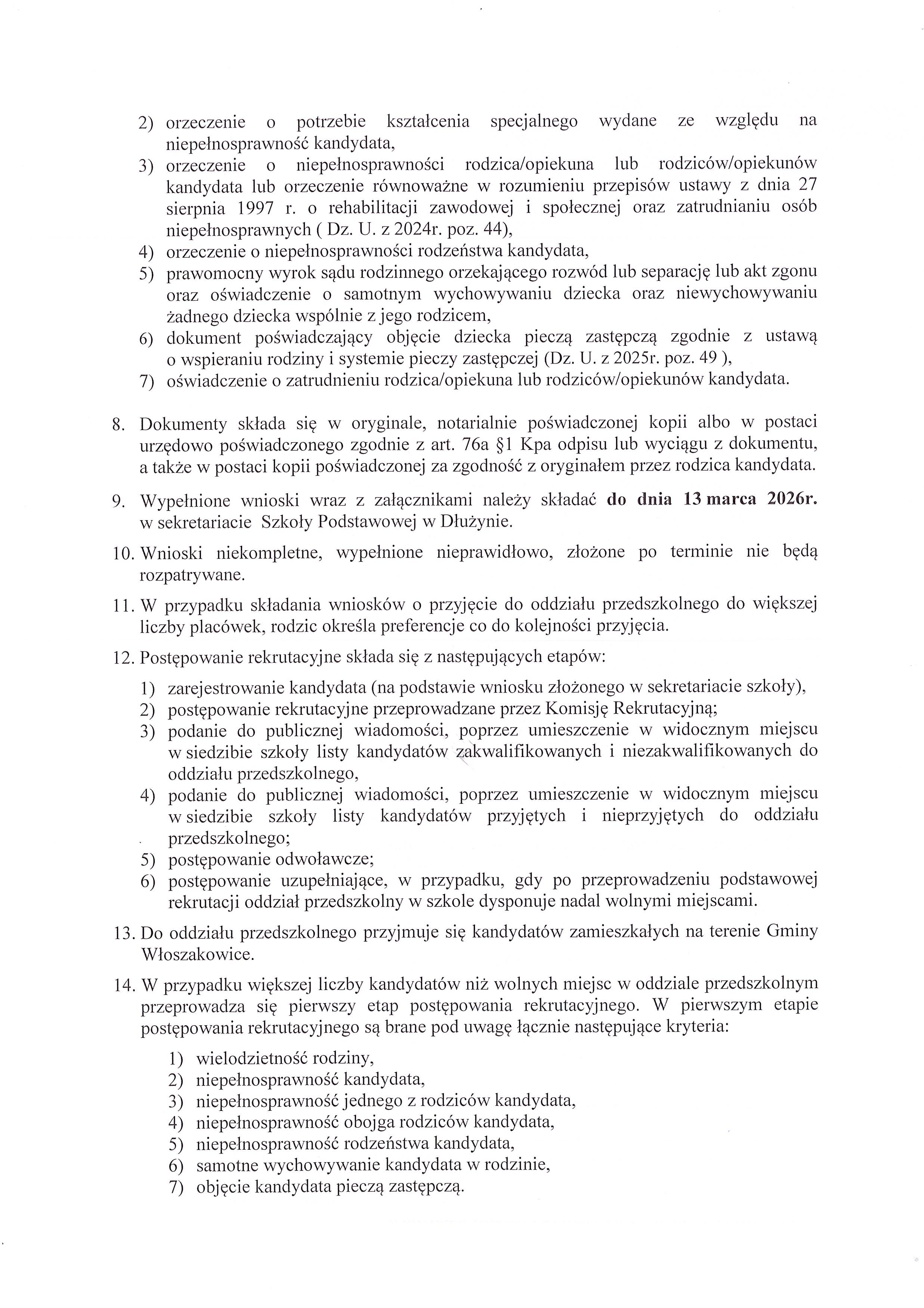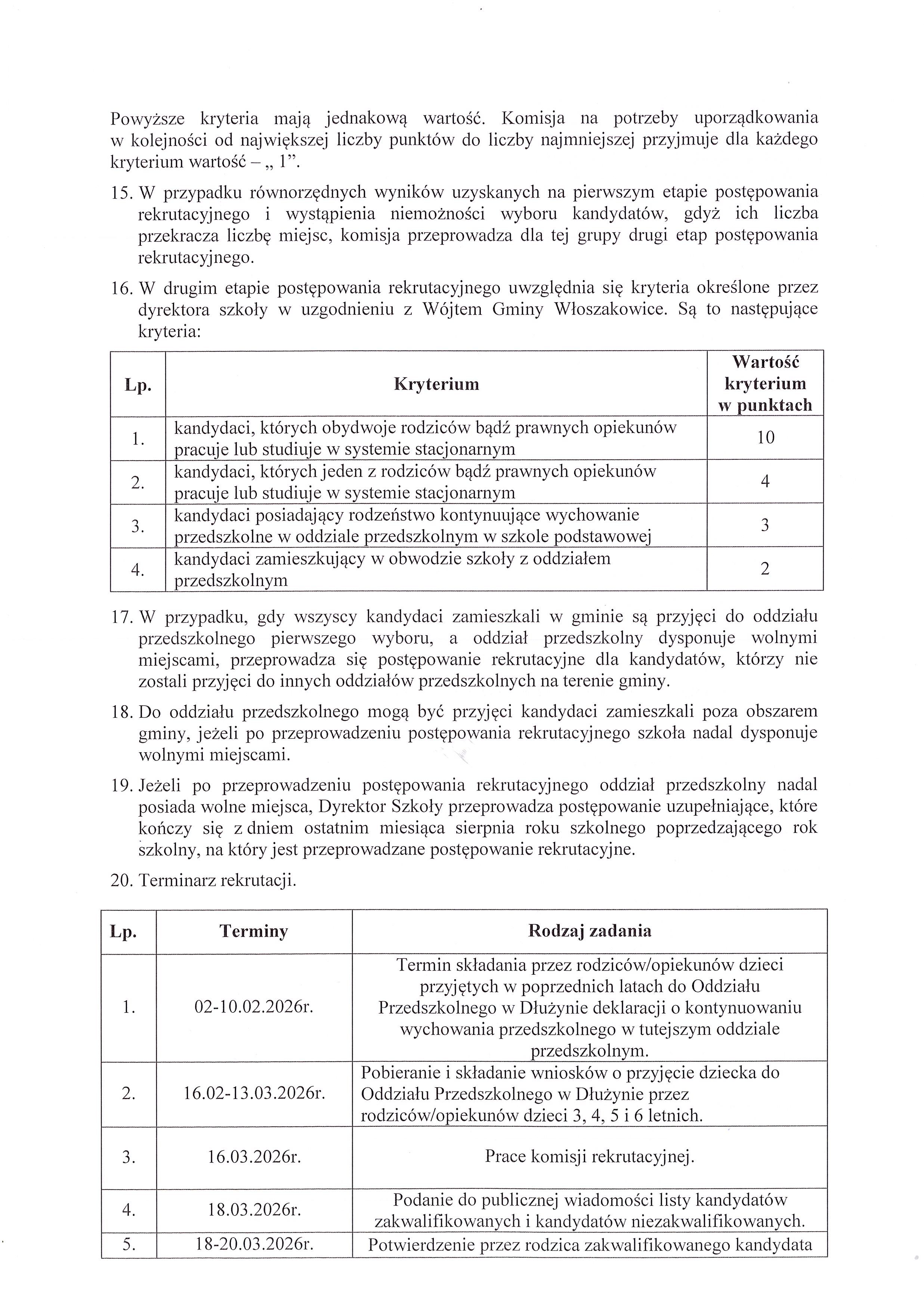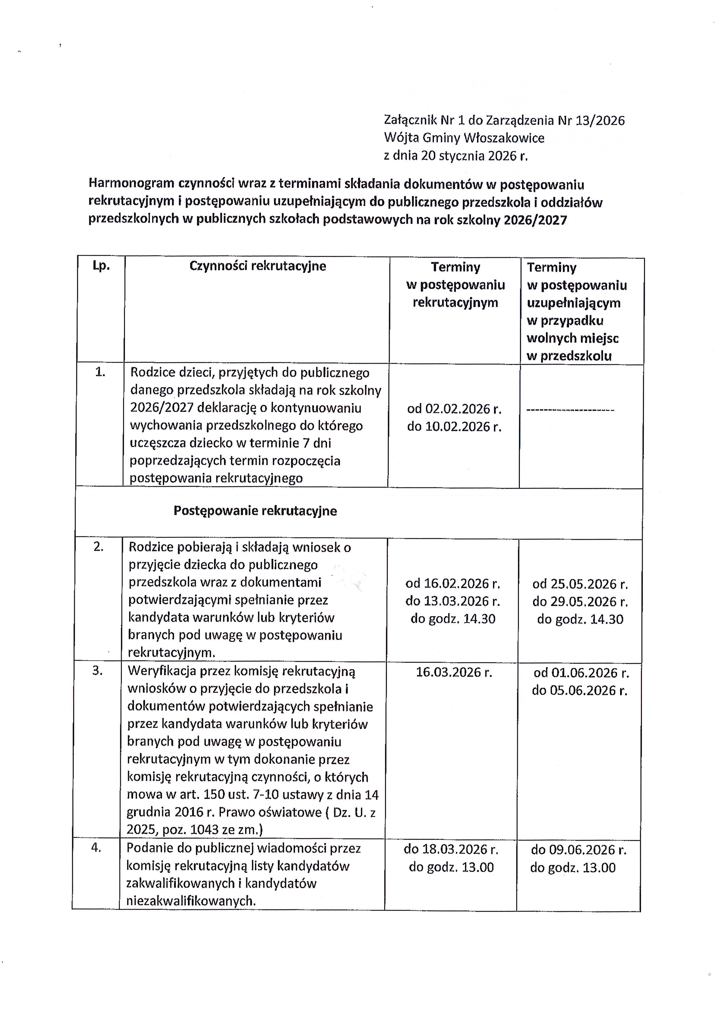 - Zarządzenie nr 13/2026 Wójta Gminy Włoszakowice z dnia 20 stycznia 2026r. w sprawie ustalenia harmonogramu czynności w postępowaniu rekrutacyjnym i postępowaniu uzupełniającym na rok szkolny 2026/2027, a także terminy składania dokumentów do przedszkola i oddziałów przedszkolnych w szkoła podstawowych oraz klas pierwszych szkół podstawowych dla których Gmina Włoszakowice jest organem prowadzącym. [zarządzenie, załącznik nr 1 - str.1 i str.2] - oddział przedszkolny, [załącznik nr 2 - str.1 i str.2] - szkoła podstawowa].