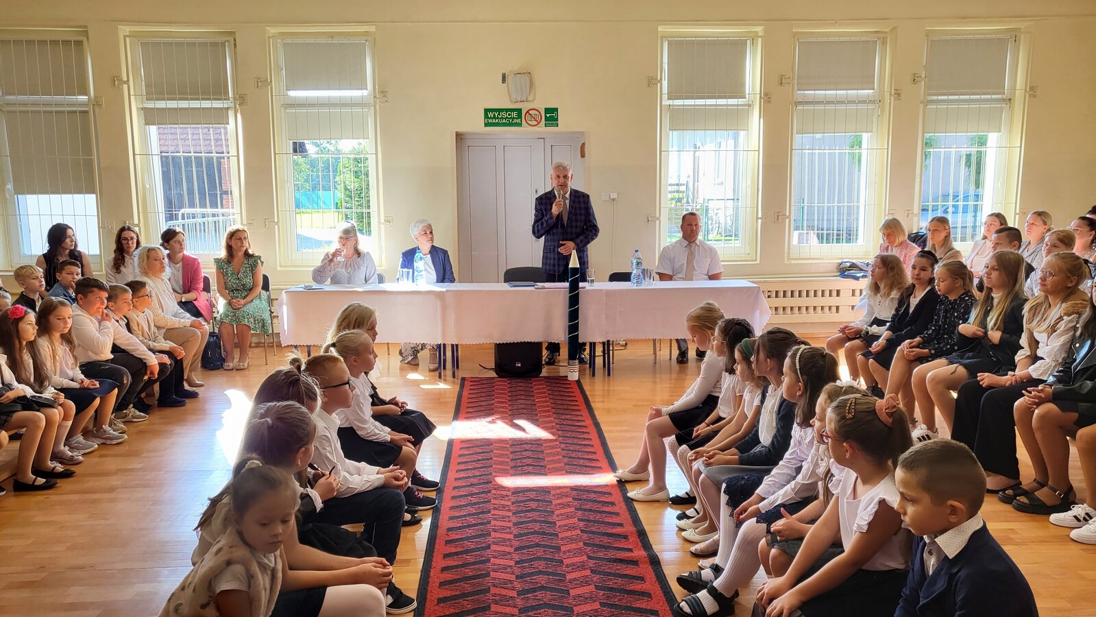 Uroczystego rozpoczęcia nowego roku szkolnego dokonał pan Dyrektor Dariusz Walczak, który powitał wszystkich zebranych oraz przedstawił zgromadzonym nowych nauczycieli naszej szkoły, nowych uczniów oraz wychowawców klas. Kolejnym punktem uroczystości było ślubowanie oraz pasowanie pierwszoklasistów na uczniów.