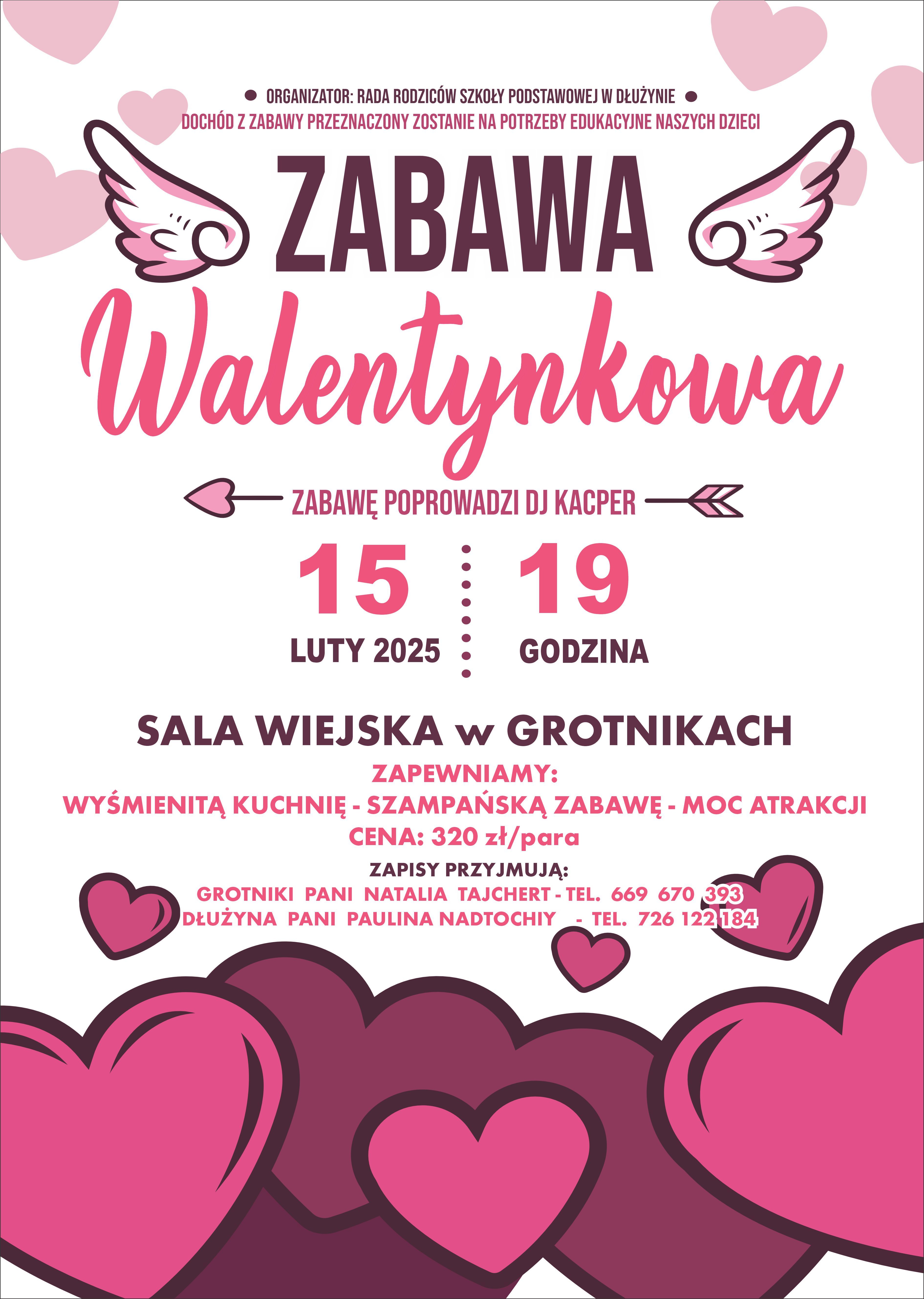 Rada Rodziców Szkoły Podstawowej w Dłużynie serdecznie zaprasza na zabawę walentynkową.